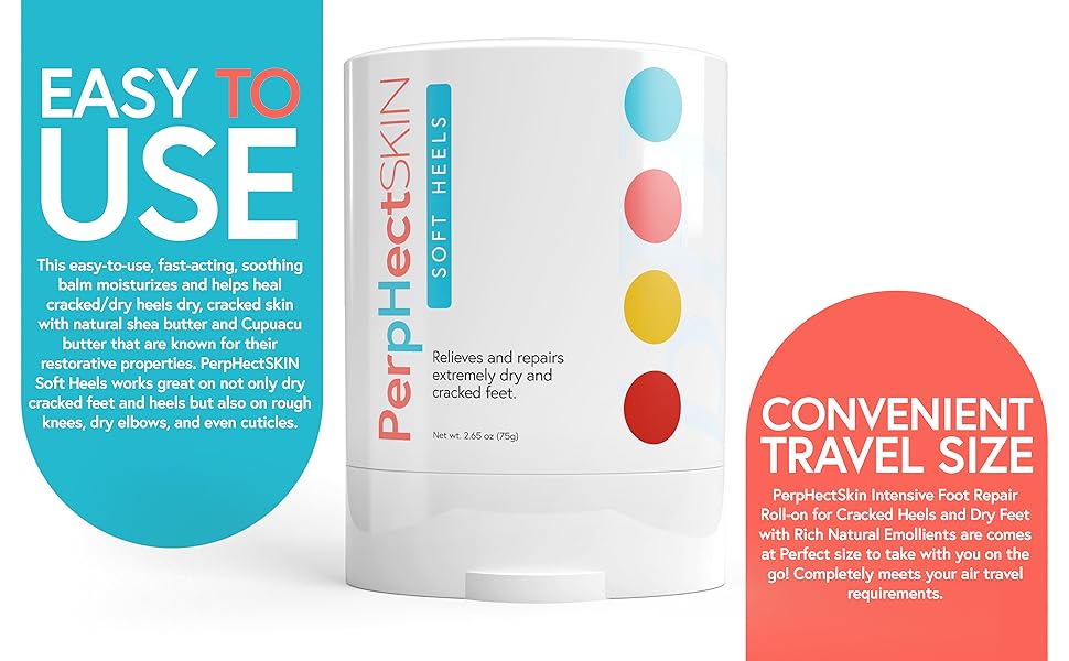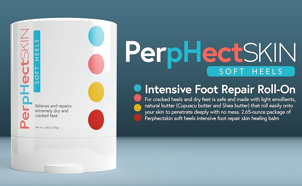 PerpHectSkin Intensive foot repair roll-on for dry cracked heels and dry feet is safe and made with light emollients, natural butter that roll easily onto your skin to penetrate deeply with no mess. This foot balm helps to penetrate thicker and rougher surface skin on the feet.